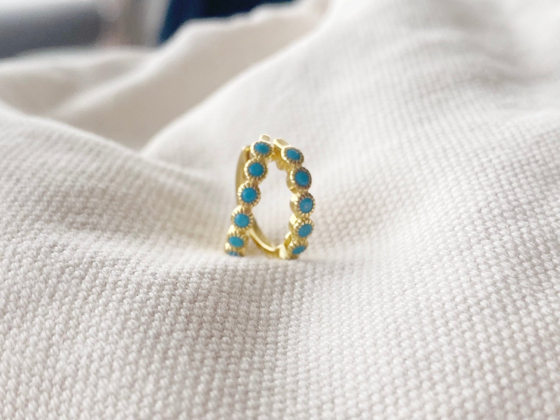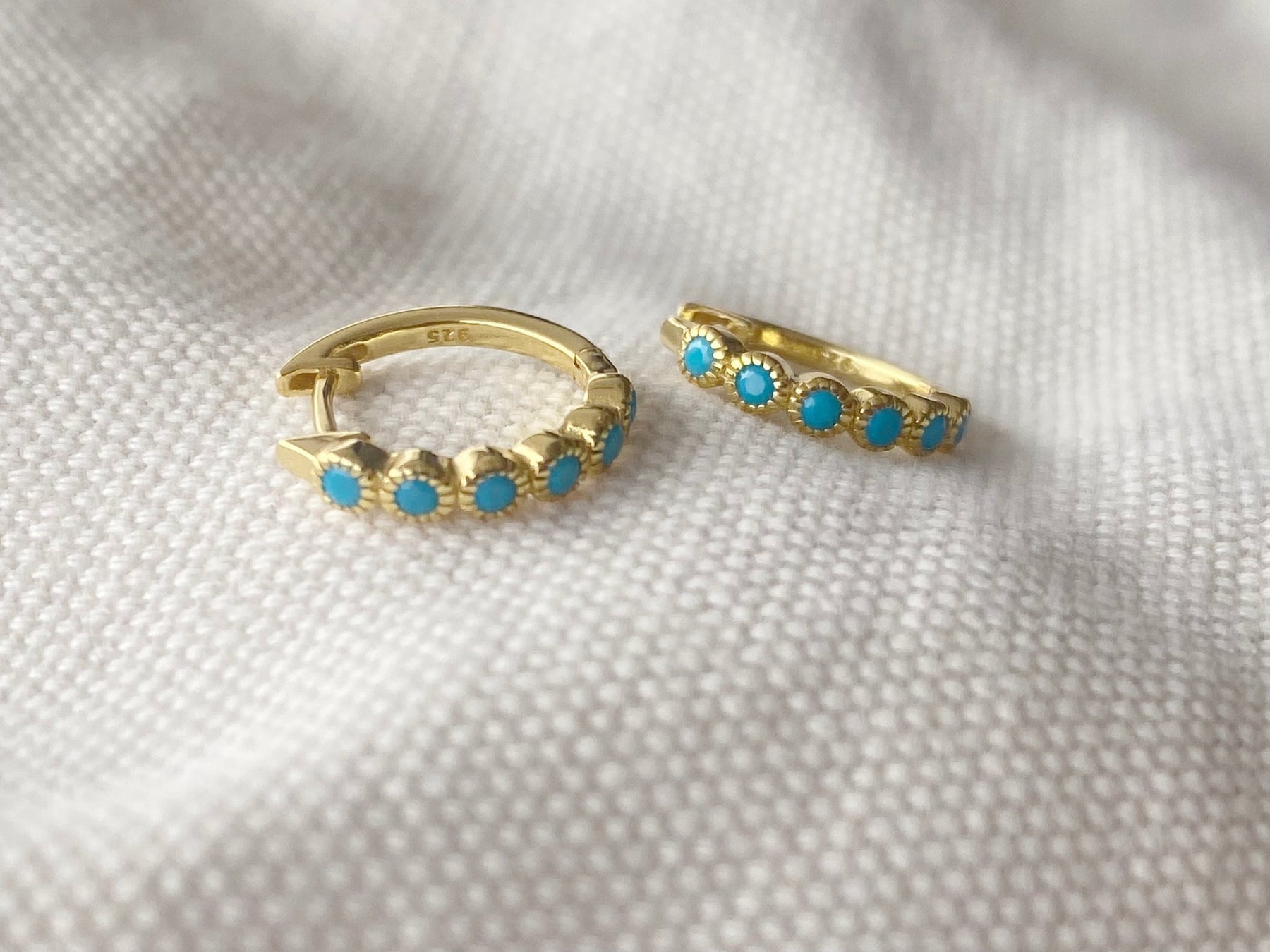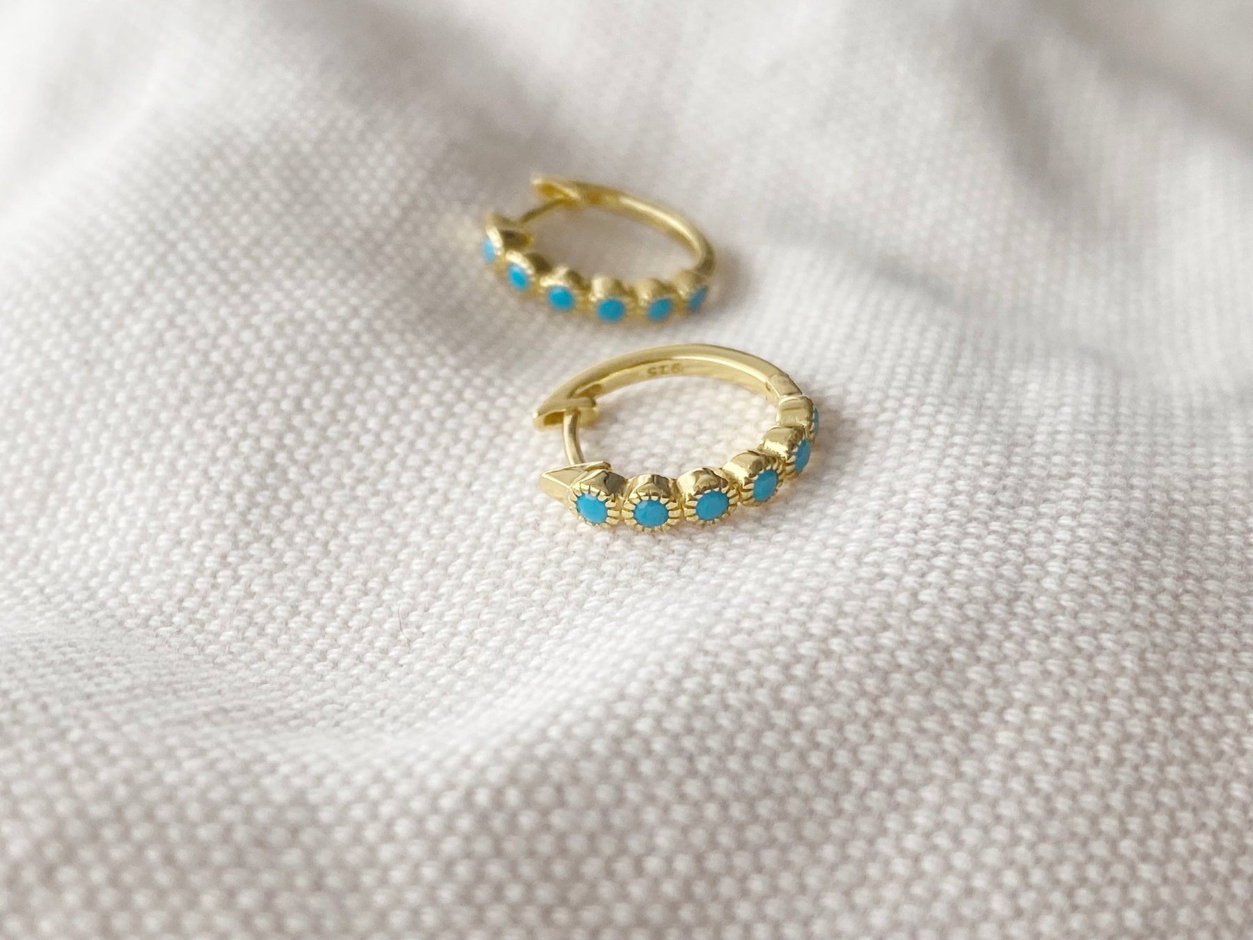 Die kleinen Creolen mit den türkisblauen Steinen sind perfekt für Boho-Looks mit Leichtigkeit und Freiheit. Das Besondere: Die kleinen Verlängerungen verdecken sowohl ausgeleierte als auch zu tief gestochene Ohrlöcher. Ob im Alltag, beim Festival oder am Meer - diese Hoops tragen Sonne im Herzen und Style am Ohr.