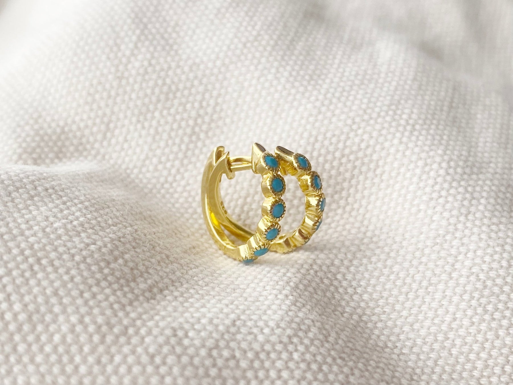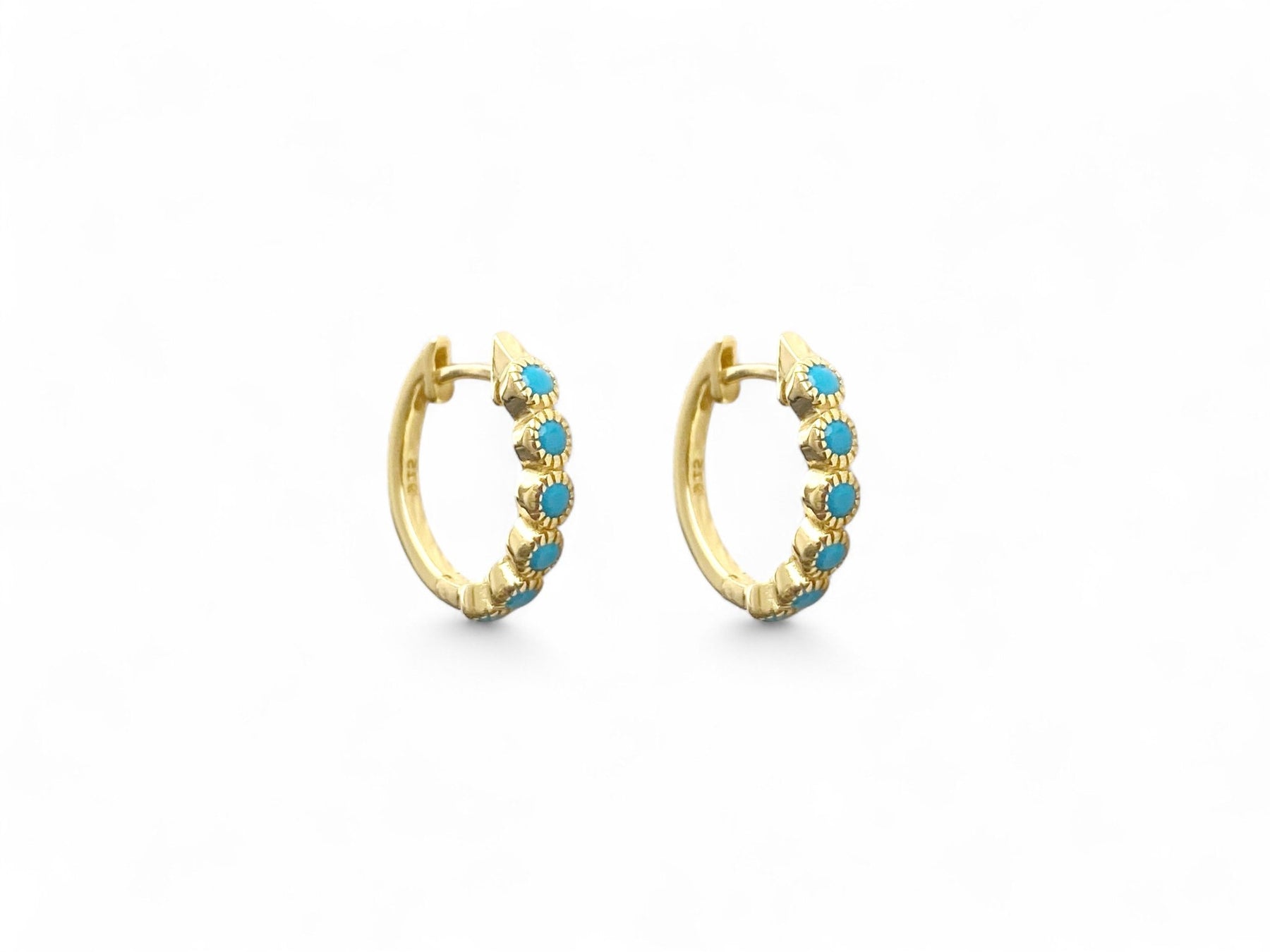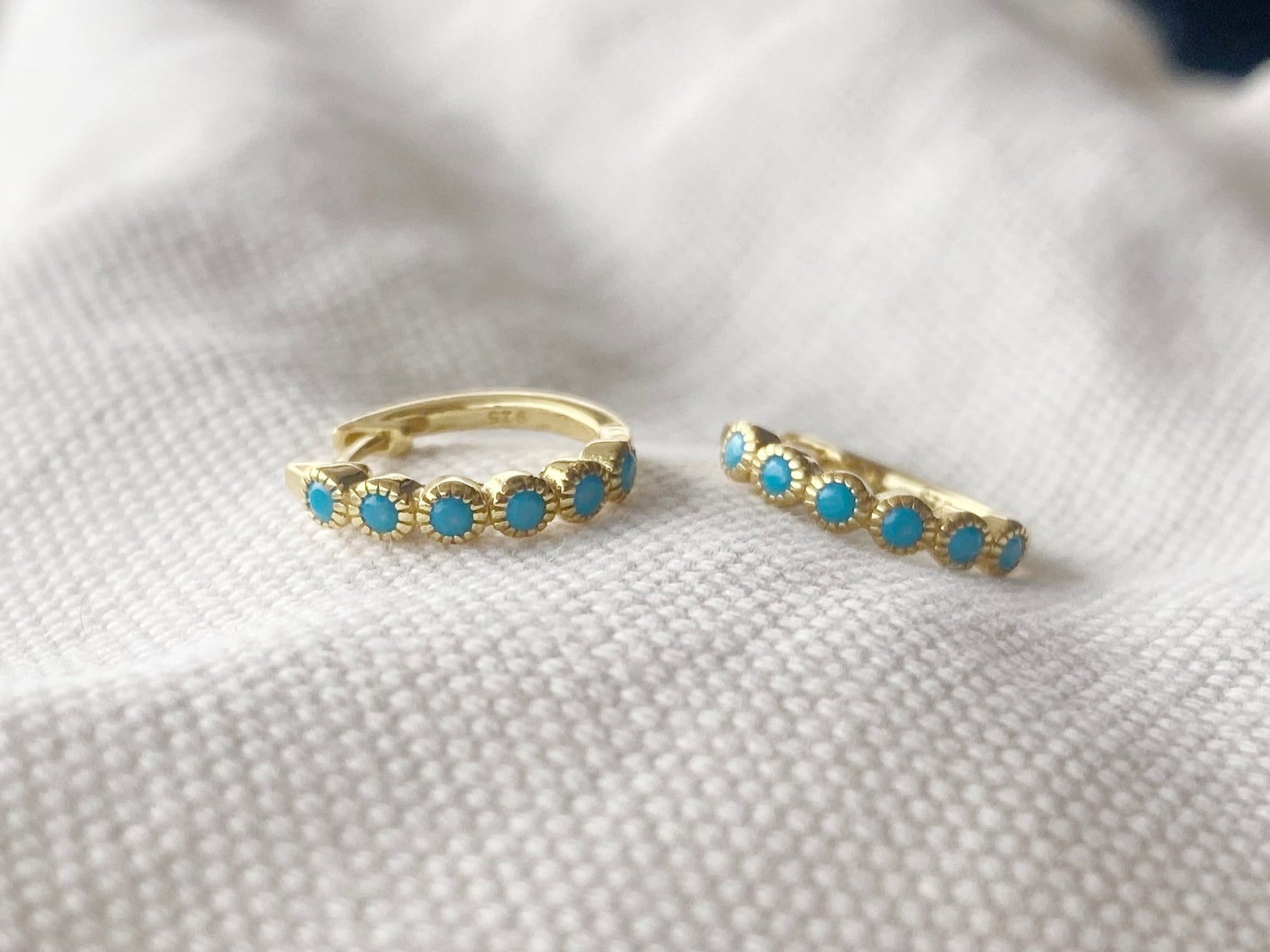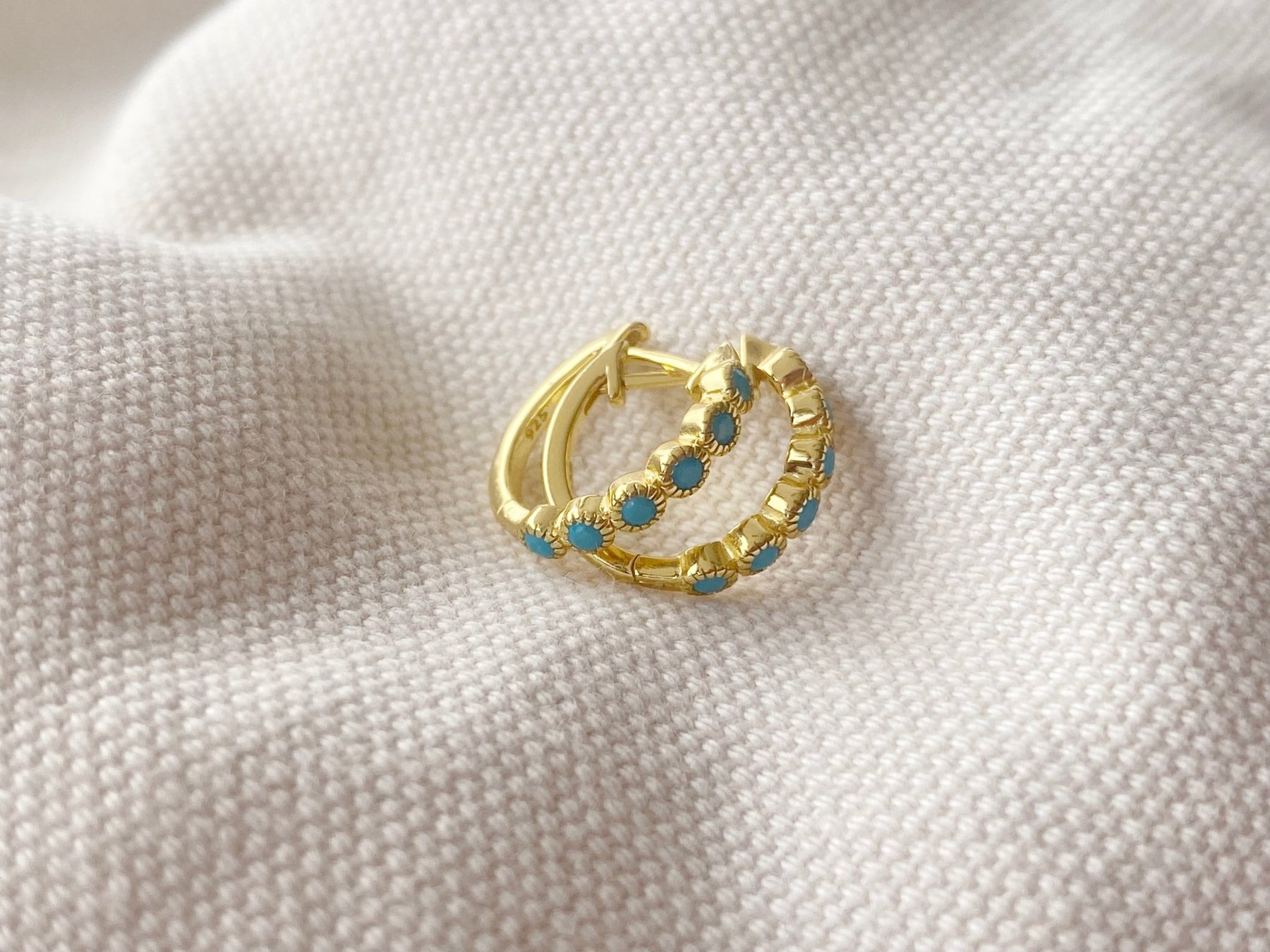 Die kleinen Creolen mit den türkisblauen Steinen sind perfekt für Boho-Looks mit Leichtigkeit und Freiheit. Das Besondere: Die kleinen Verlängerungen verdecken sowohl ausgeleierte als auch zu tief gestochene Ohrlöcher. Ob im Alltag, beim Festival oder am Meer - diese Hoops tragen Sonne im Herzen und Style am Ohr.