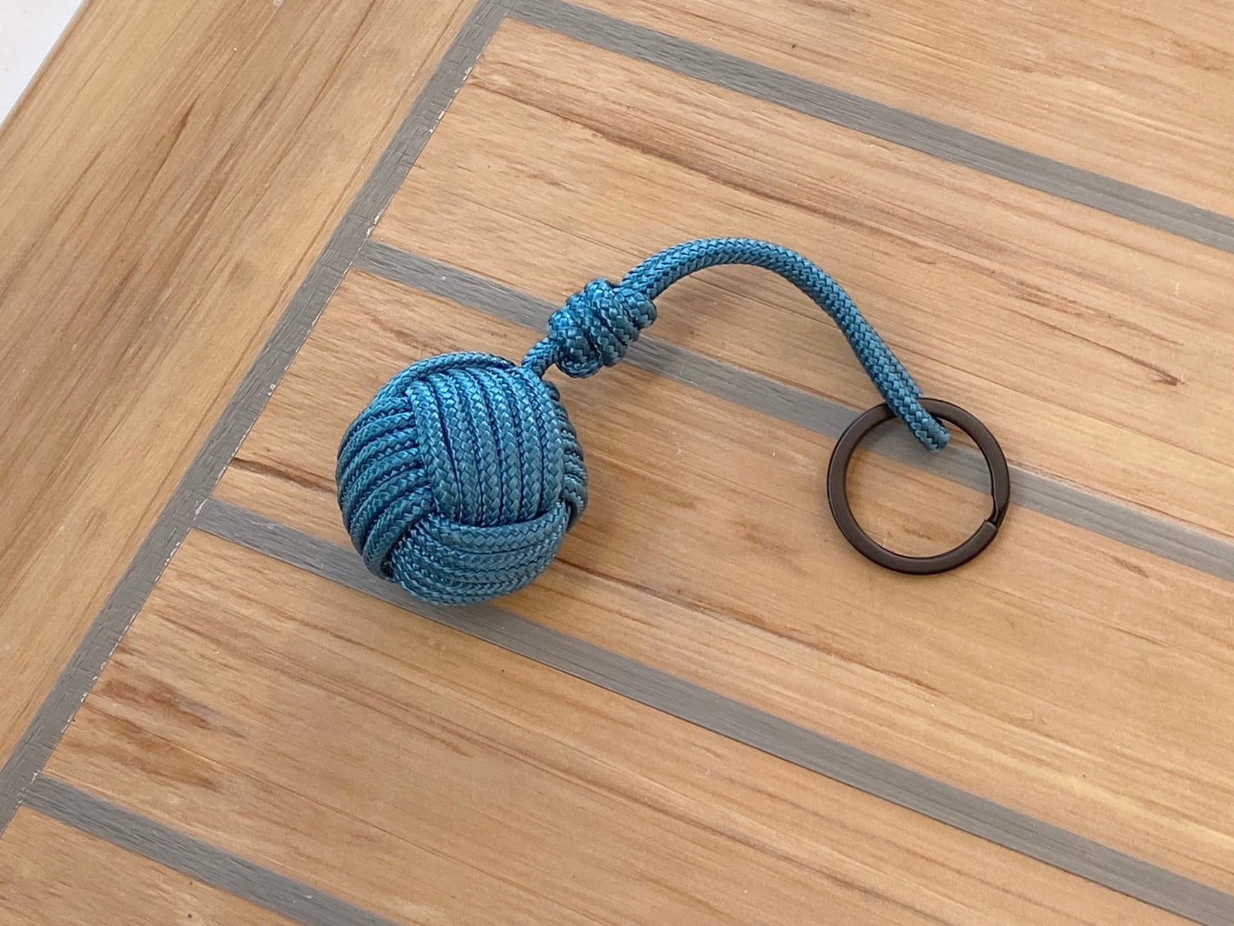Der aufwendige Knoten rund um die Holzkugel stammt aus der Seefahrt und wird dort als „Affenfaust“ bezeichnet. Baugleich, mit in einem wesentlich größeren Umfang ist er an den Enden der Leinen befestigt und wird den am Pier stehenden Hafenleuten zugeworfen, die ihn auffangen und die Leinen an den Klampen befestigen.