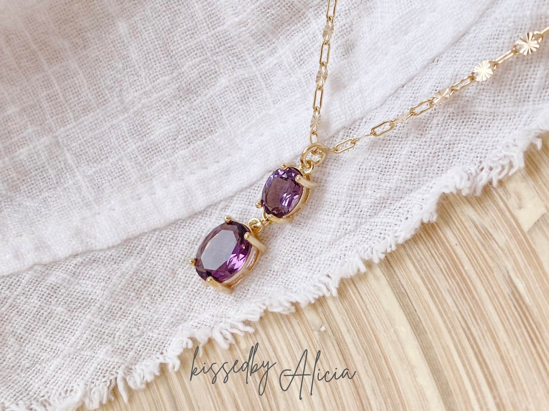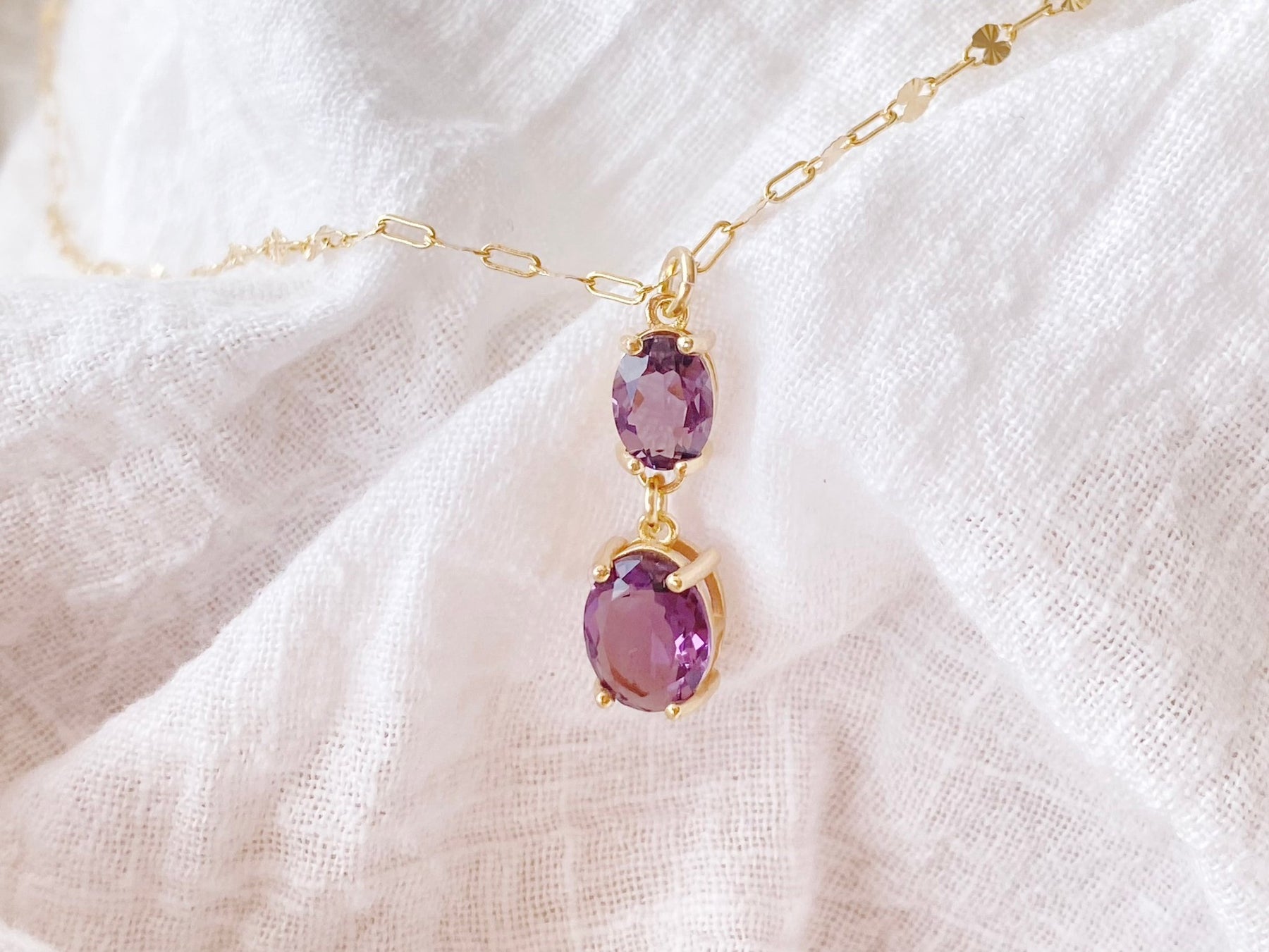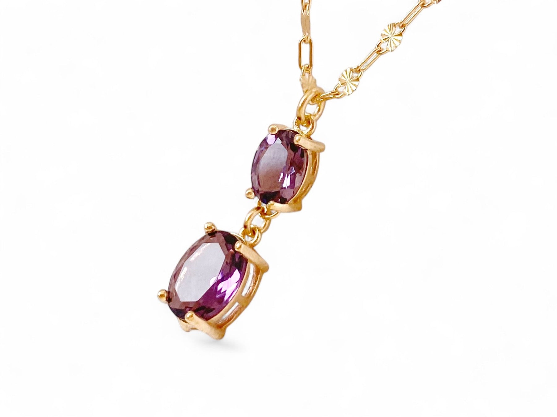 In tiefem Violett erstrahlen die ovalen, akkurat geschliffenen und in Gold gefassten Kristalle an der liebevoll gearbeiteten Kette. Dank präzise in wechselnder Abfolge angeordneten Paperclip- und Sonnengliedern ändert die Halskette je nach Blickwinkel ihren Style.