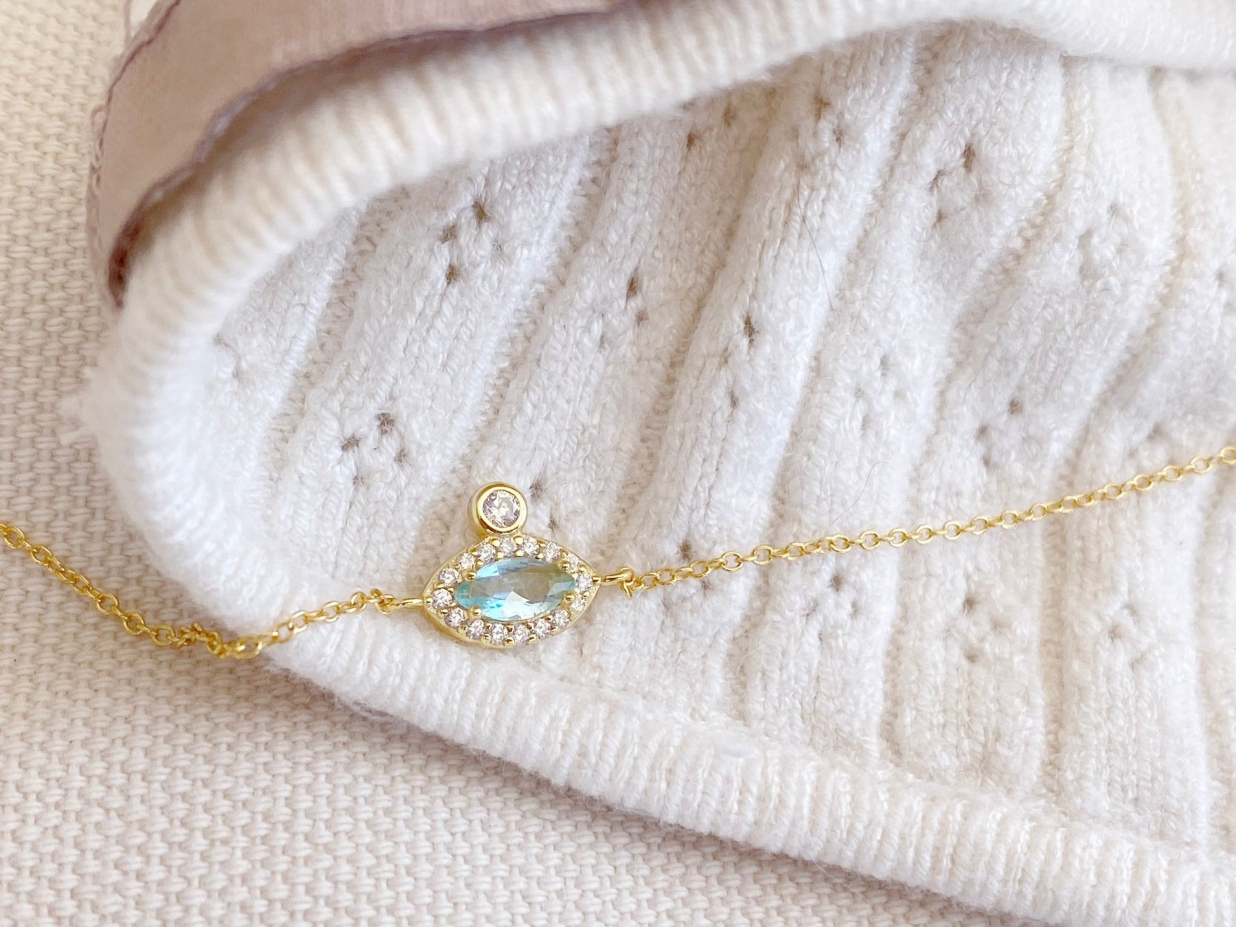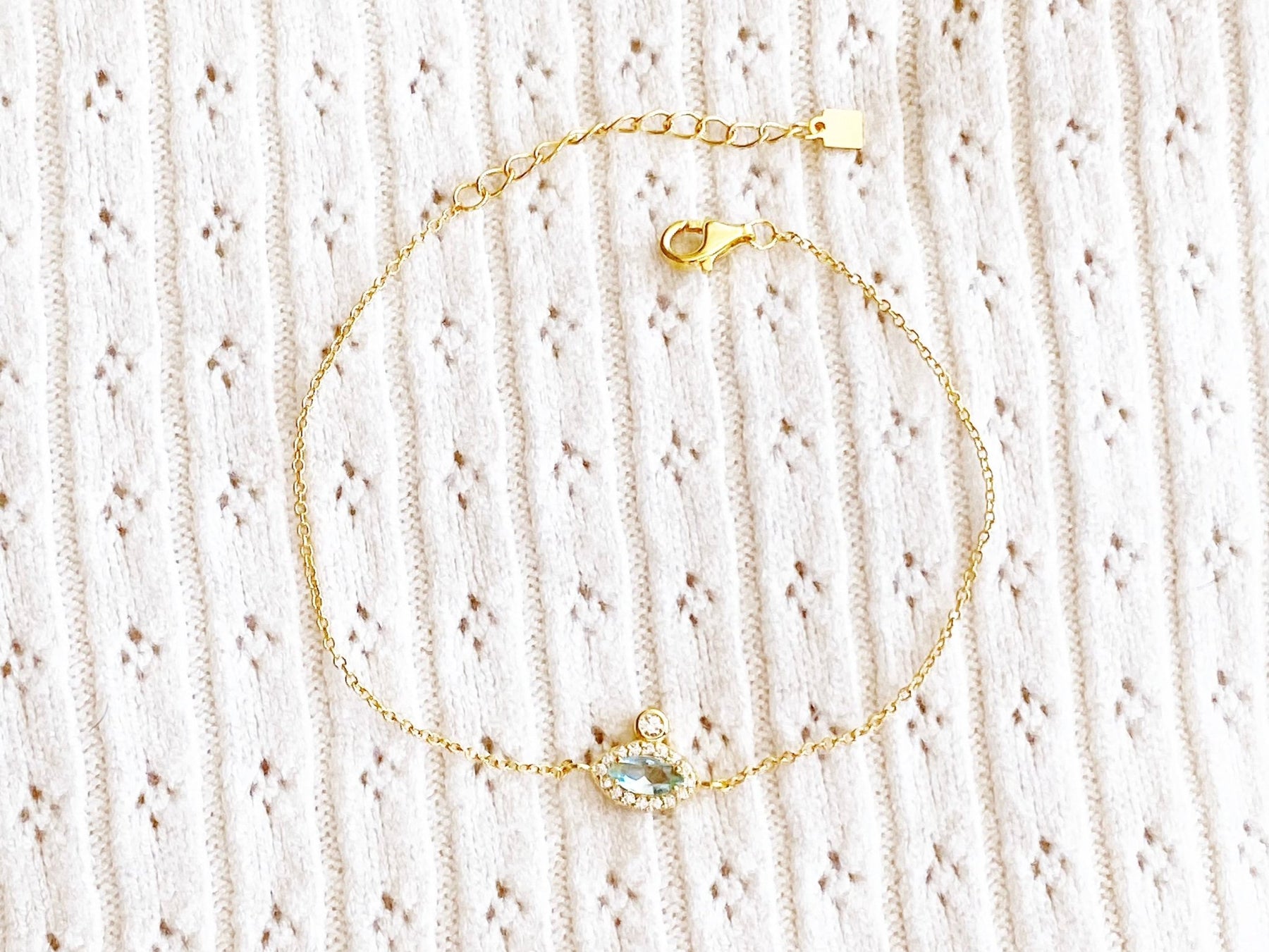 Filigranes vergoldetes Armband mit hellblauem Stein und unzähligen weißen Zirkonen: Ob pur getragen oder mit anderen feinen Armbändern kombiniert, das romantische Armband ist ein wunderschöner Hingucker! Dank fein ausgewählten Materialien und der sorgfältigen Verarbeitung kann es auch von Menschen mit sensibler Haut problemlos getragen werden.