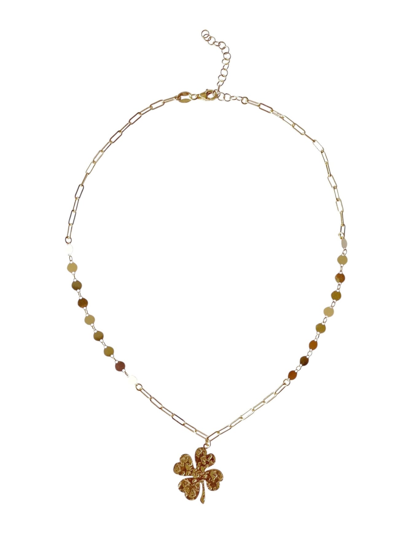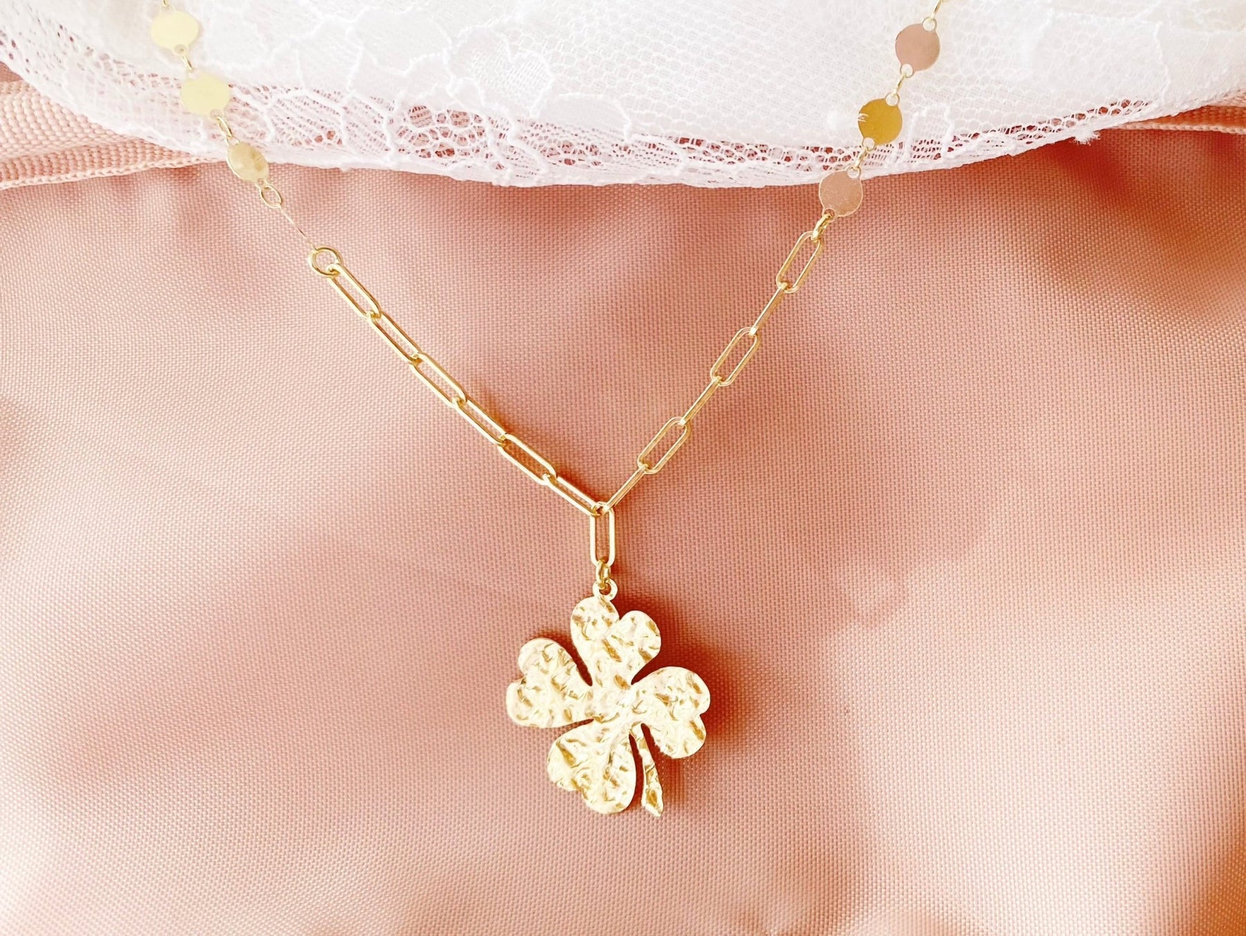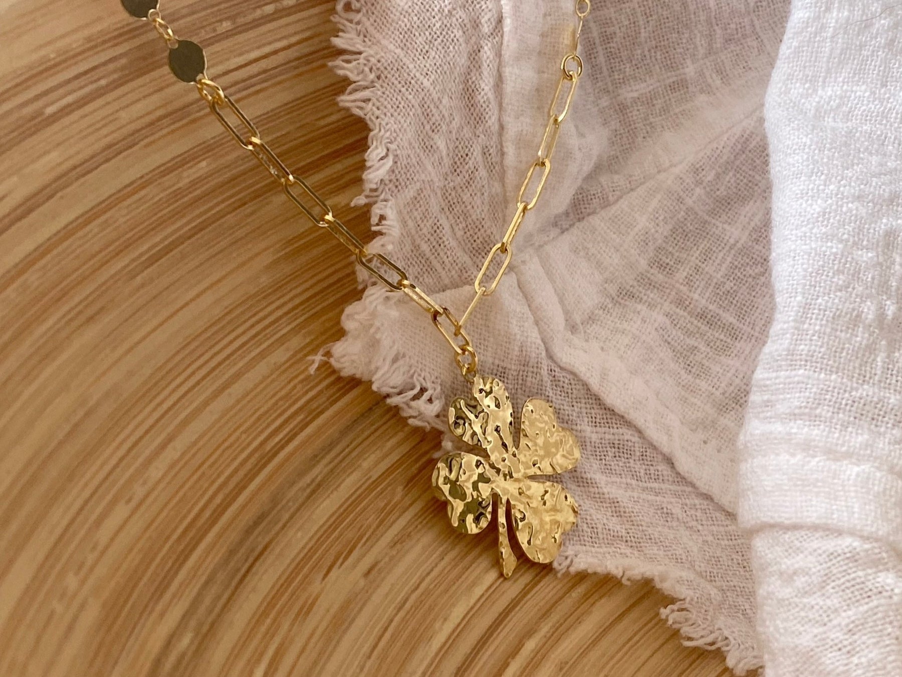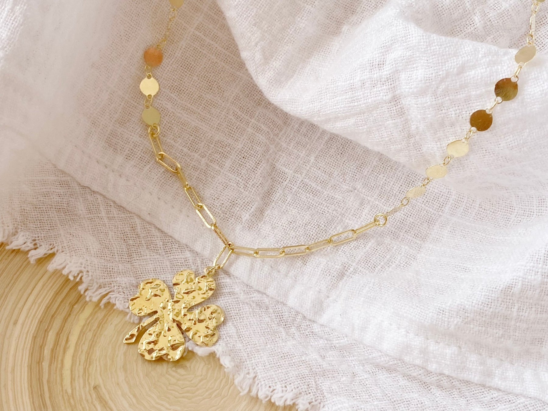 Liebevoll zur Haut und in wunderschönem Design ist die Kleeblatt Halskette ein wahrer Glücksbringer! Verziert mit einem zarten gehämmerten Kleeblatt und mit einer Kette aus Paperclip- und Coin-Gliedern sieht man dem Schmuckstück seinen besonderen Charakter sofort an. Die Halskette ist aus feinsten Materialien in Handarbeit hergestellt und steht komplett für sich allein - einfach toll als solo getragenes Schmuckstück, für ganz besondere Momente des Alltags und zu festlichen Anlässen.