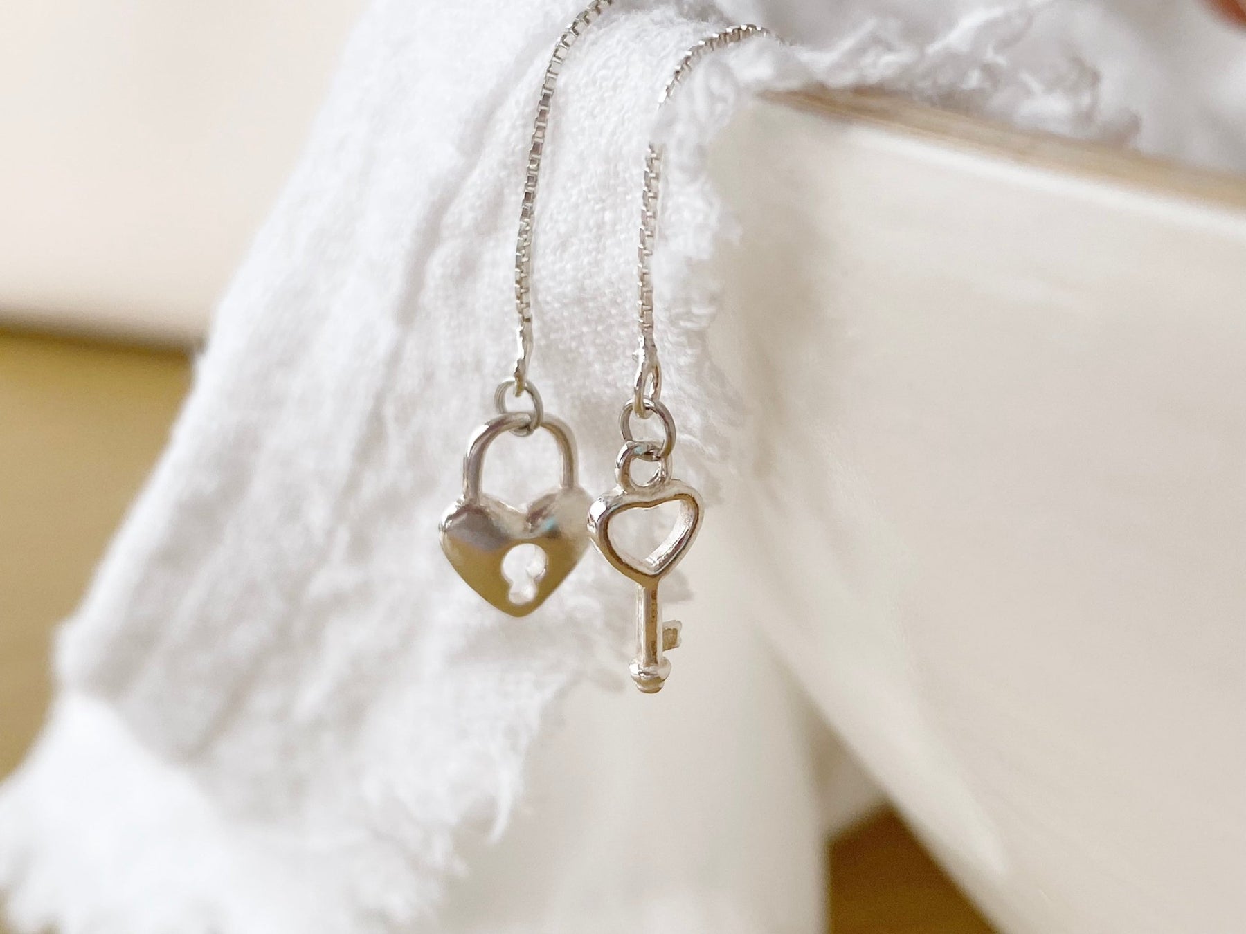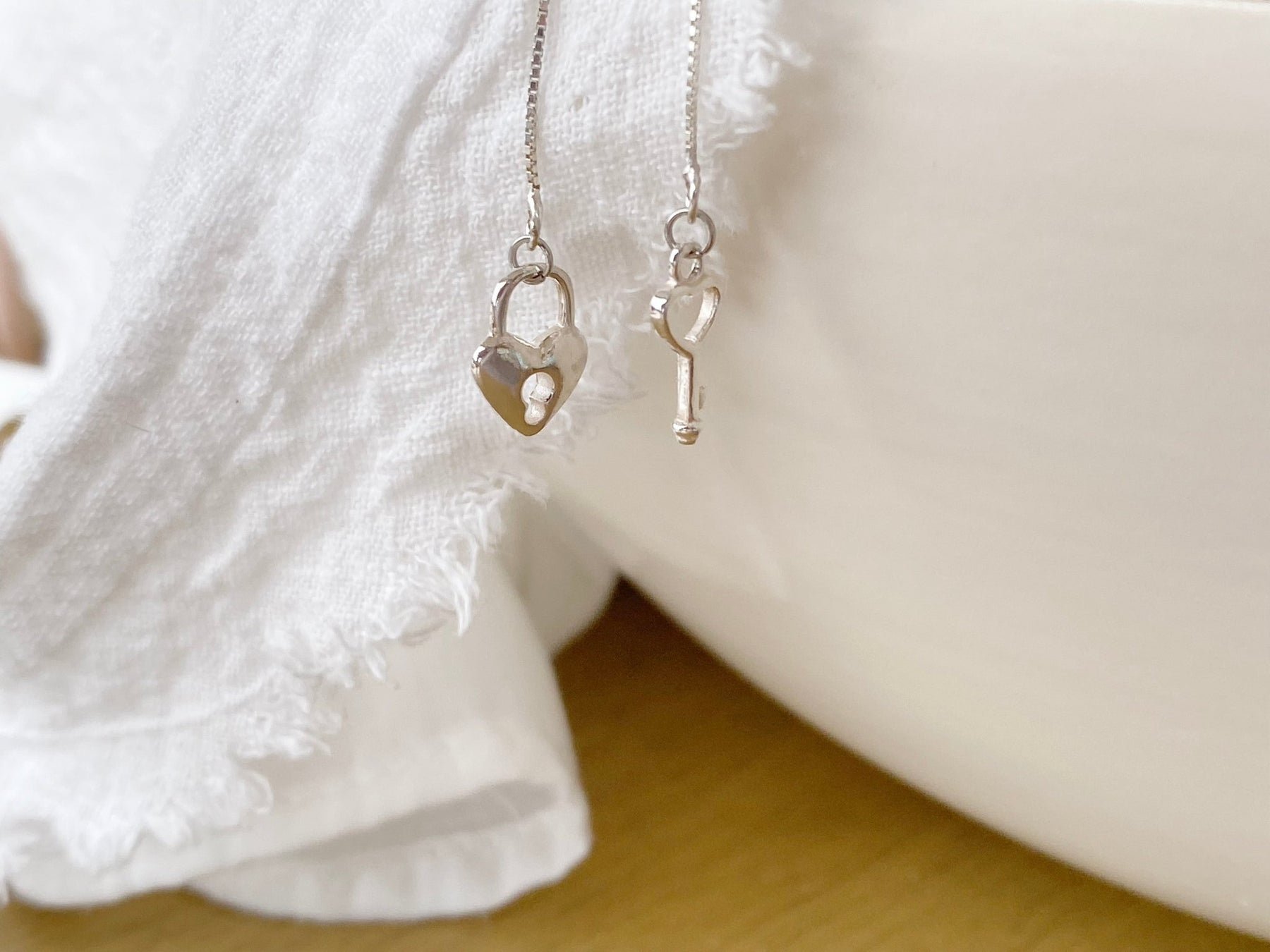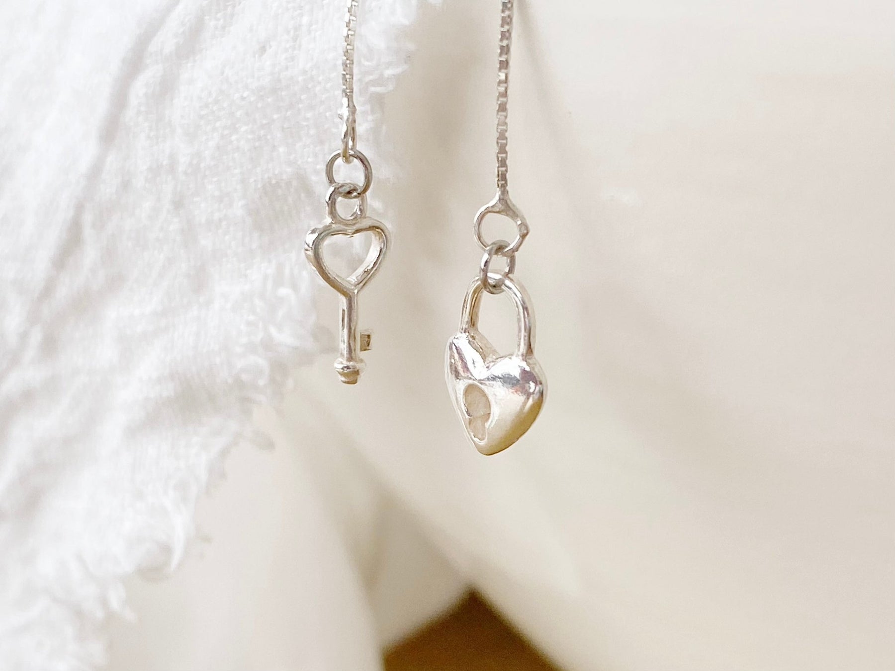 An feinen Silberkettchen hängen Schloss und Schlüssel in romantischer Herzchenform! Ob als Liebeserklärung oder als Freundschaftsschmuck - die Silberohrringe schwingen bei jeder Bewegung an deinem Ohr und sind nicht nur wunderschön, sondern auch absolut sanft zu deiner Haut!