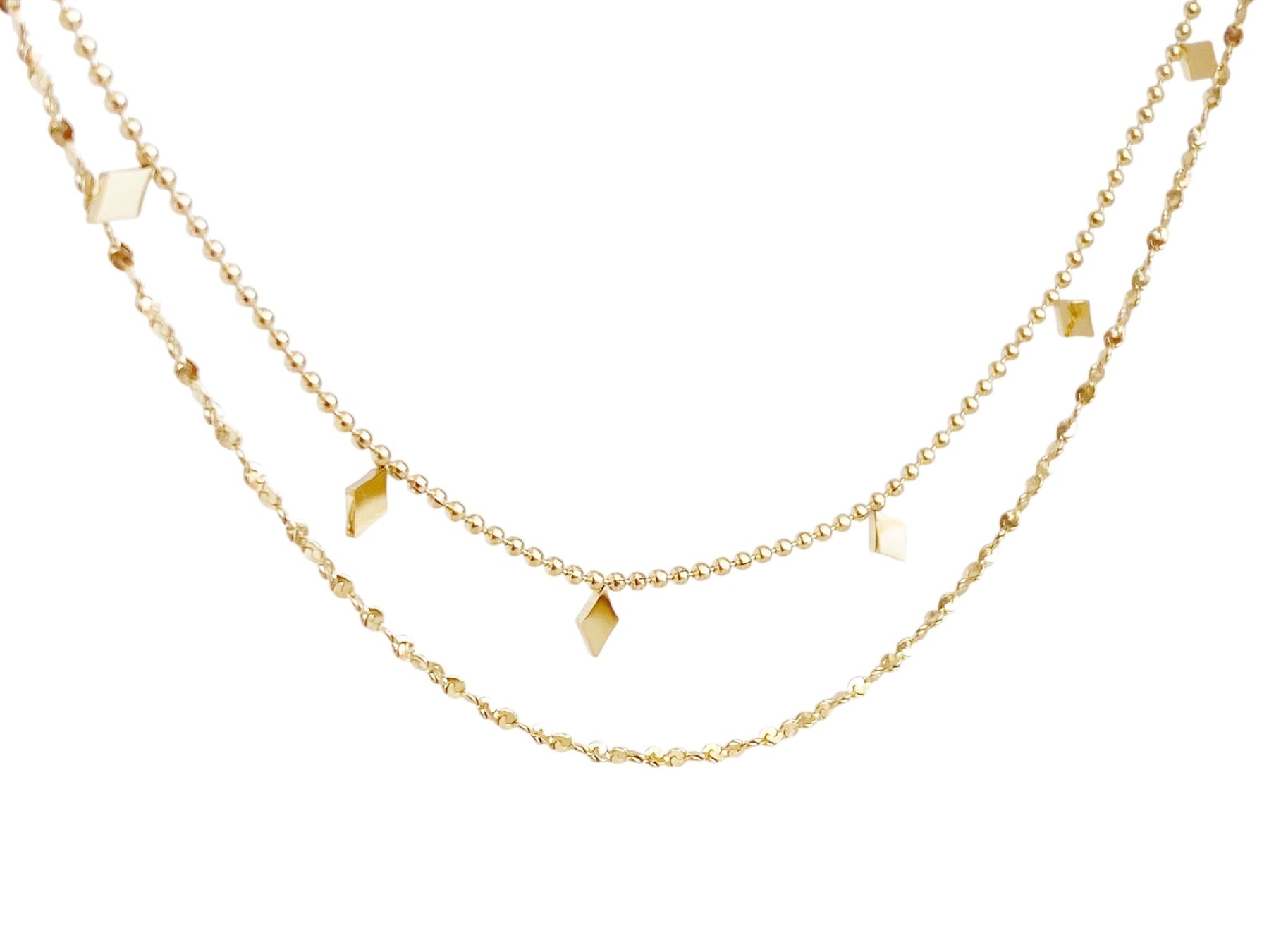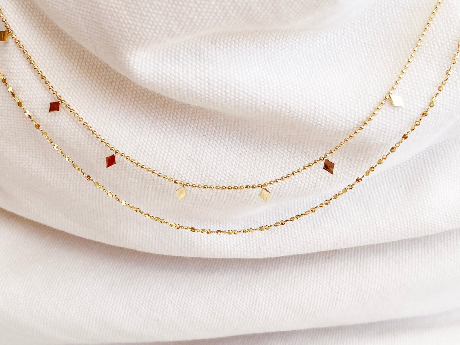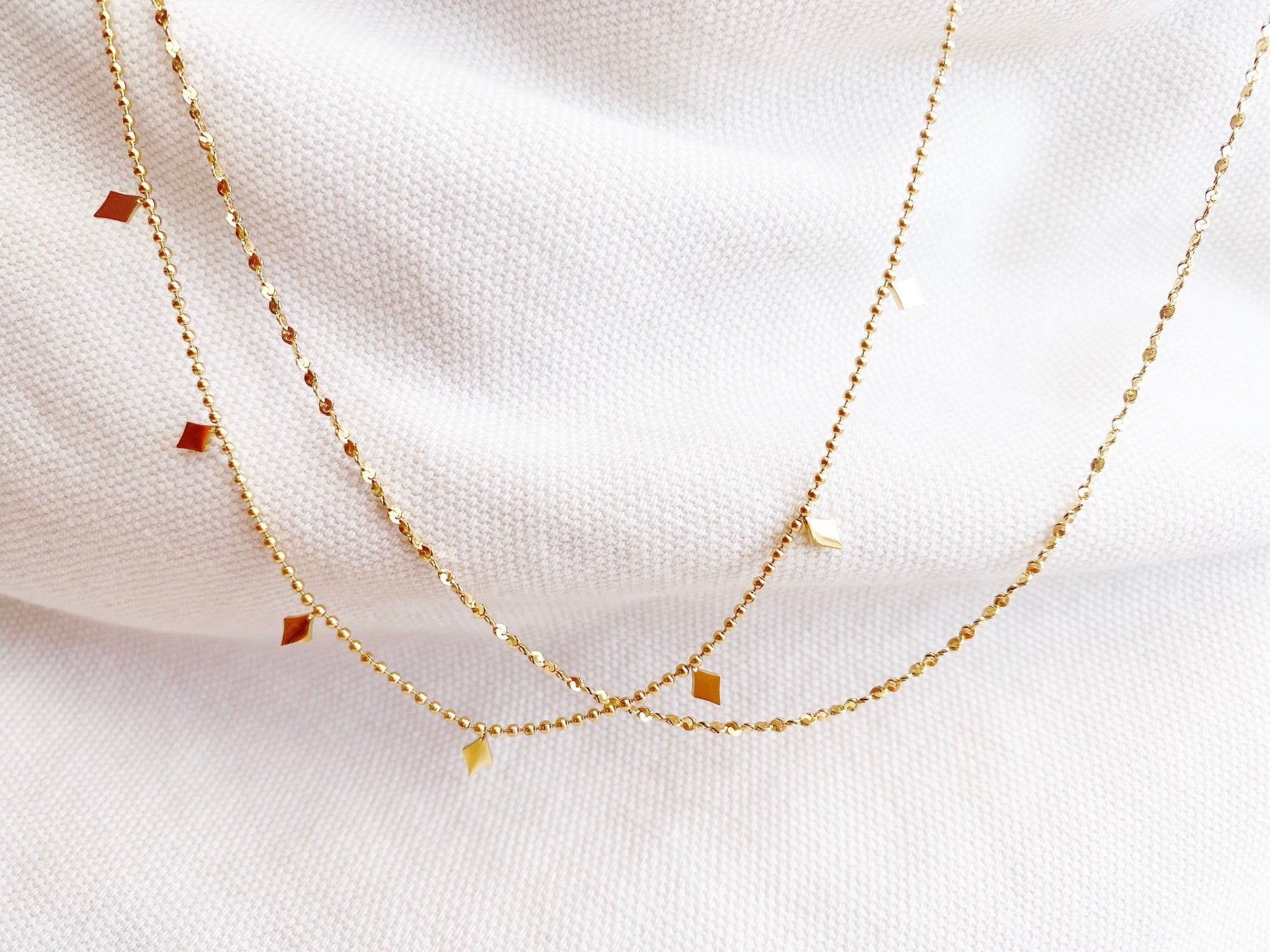 Die funkelnde Edelstahl Doppelkette strahlt vor Detailreichtum! Die kürzere Kette besticht durch filigrane Kügelchen-Details und funkelnde eckige Plättchen, die das Licht bei jeder Bewegung reflektieren. Die längere Kette ist ein gedrehter Strang aus glitzernden und glänzenden Gliedern. Wasserfest, hypoallergen und einfach unkompliziert!