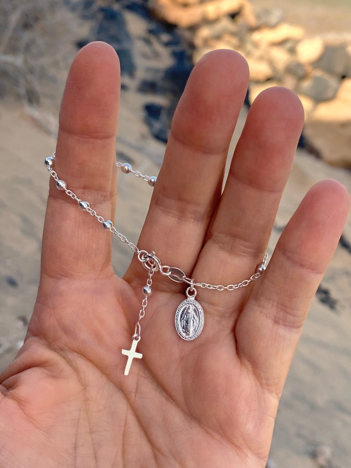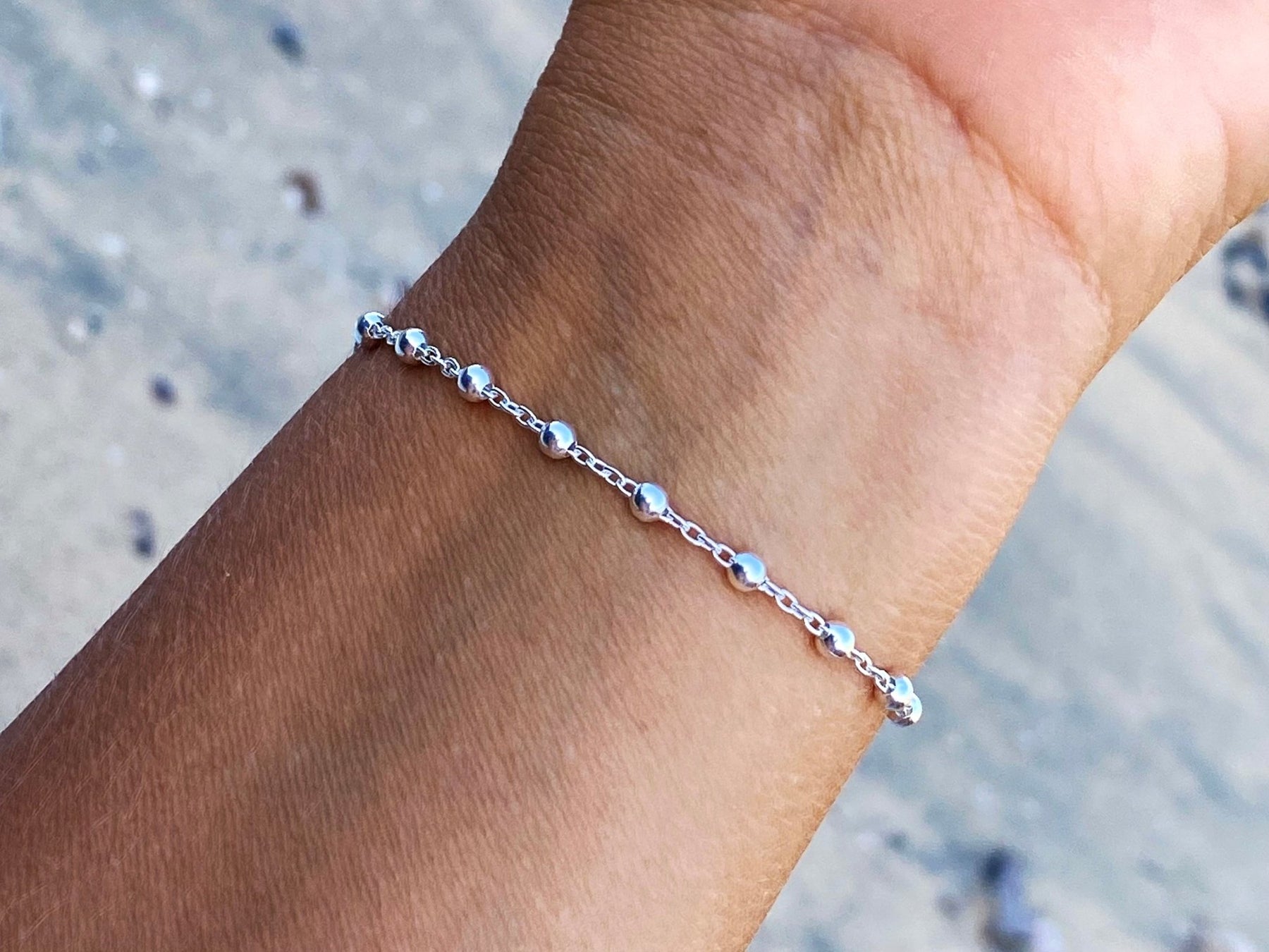 Ein Schmuckstück wie ein Talisman: Das silberne Vintage Armband wirkt wie ein Schatz von einem Flohmarkt in Südfrankreich! Es ist verziert mit großen schimmernden Satelliten-Perlen, einem kleinen Kreuz und einem nostalgischen Coin Charm und klimpert leise, wenn du dich bewegst. Als dein treuer Begleiter und Glücksbringer ist es angenehm zu tragen, freundlich zu deiner Haut und ebenso besonders wie wunderschön!