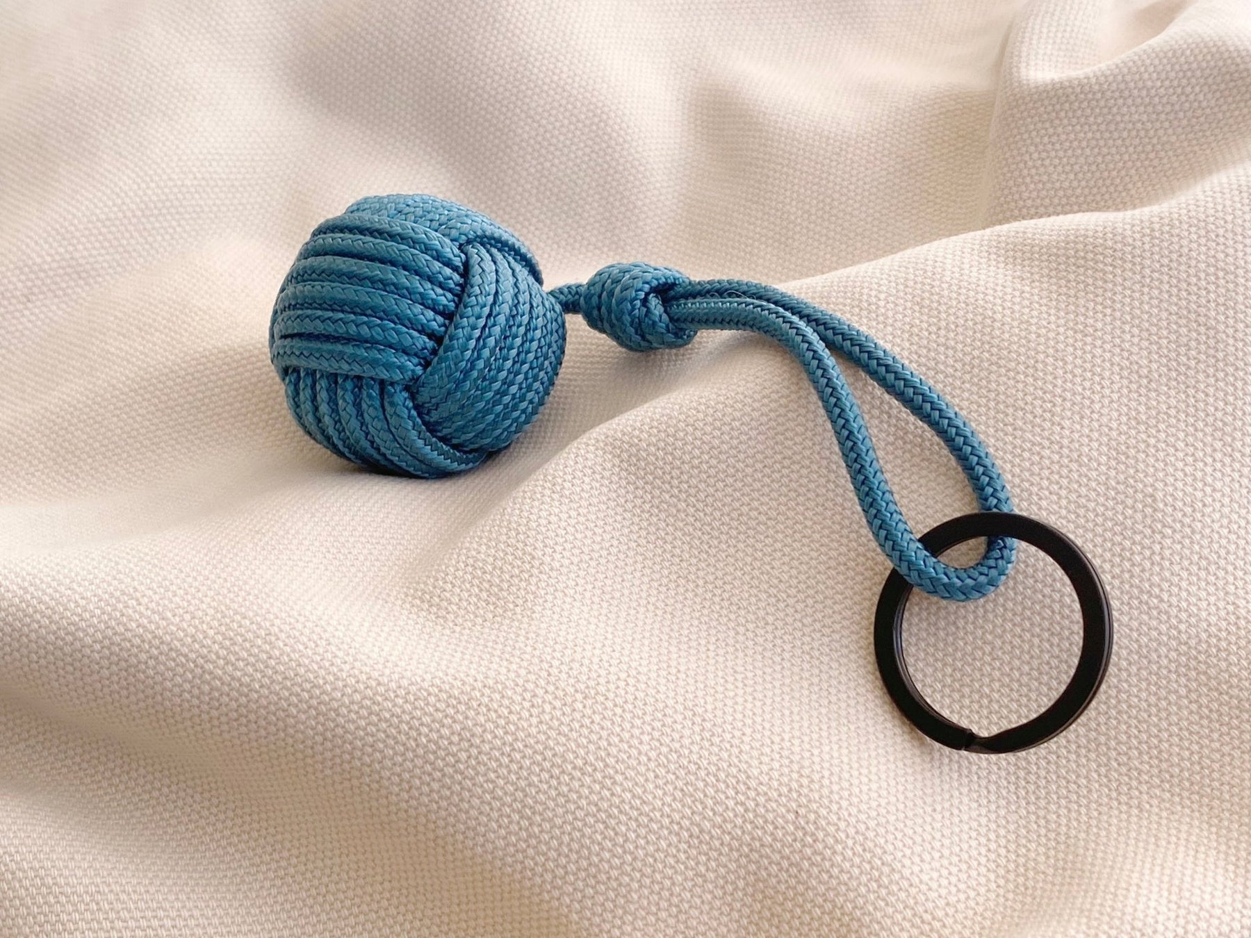 Der aufwendige Knoten rund um die Holzkugel stammt aus der Seefahrt und wird dort als „Affenfaust“ bezeichnet. Baugleich, mit in einem wesentlich größeren Umfang ist er an den Enden der Leinen befestigt und wird den am Pier stehenden Hafenleuten zugeworfen, die ihn auffangen und die Leinen an den Klampen befestigen.