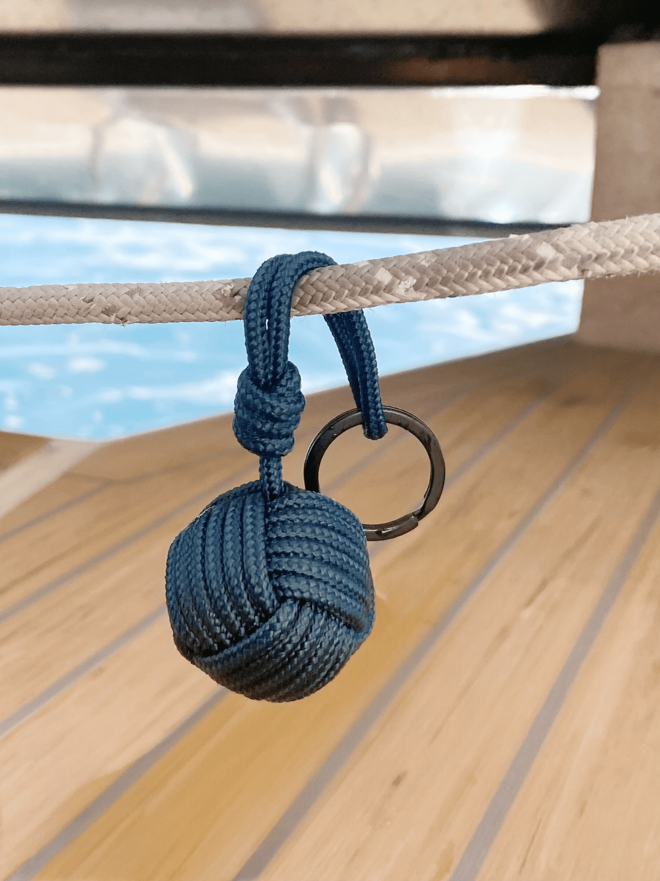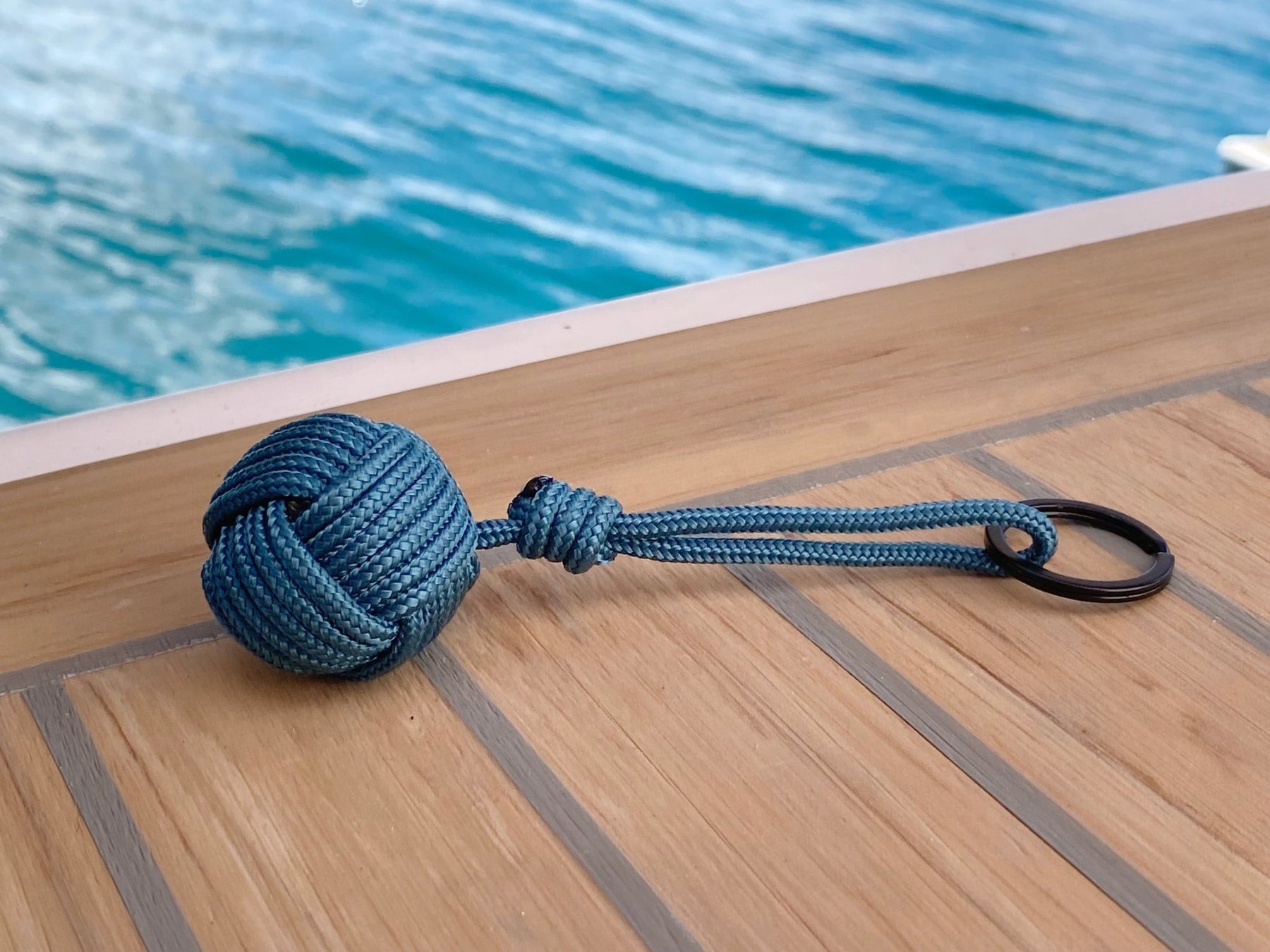 Ein Stück Geschichte für deine Tasche oder den Schlüsselbund deines Mannes: Unser handgemachter Schlüsselanhänger in türkisblau mit schwarzem Schlüsselring ist mehr als nur ein Accessoire - er erzählt von Freiheit, Fernweh und den Abenteuern auf See. Gefertigt aus echtem, recyceltem Segelseil, einer massiven Holzkugel und gebunden in einem traditionellen Seemannsknoten, trägt jedes Stück die Spuren vergangener Reisen. Robust, maritim und einzigartig – dein persönlicher Begleiter mit Charakter.