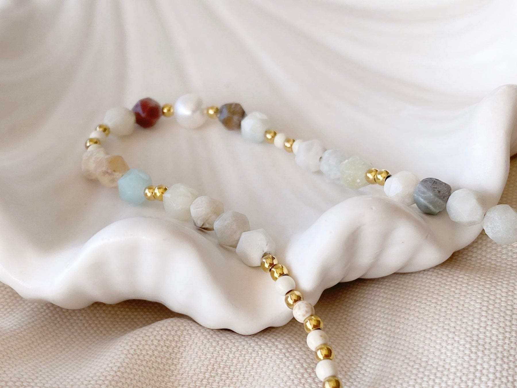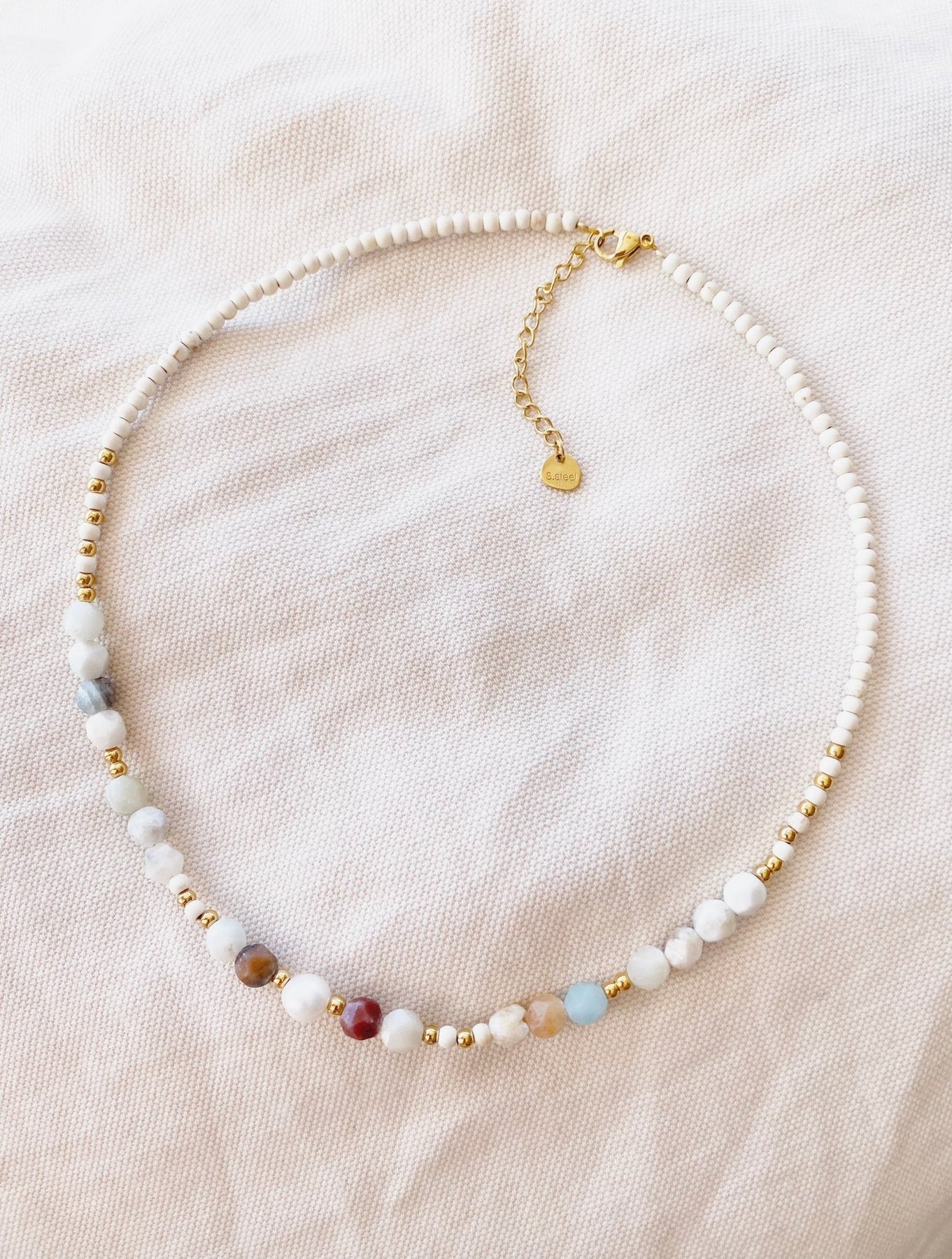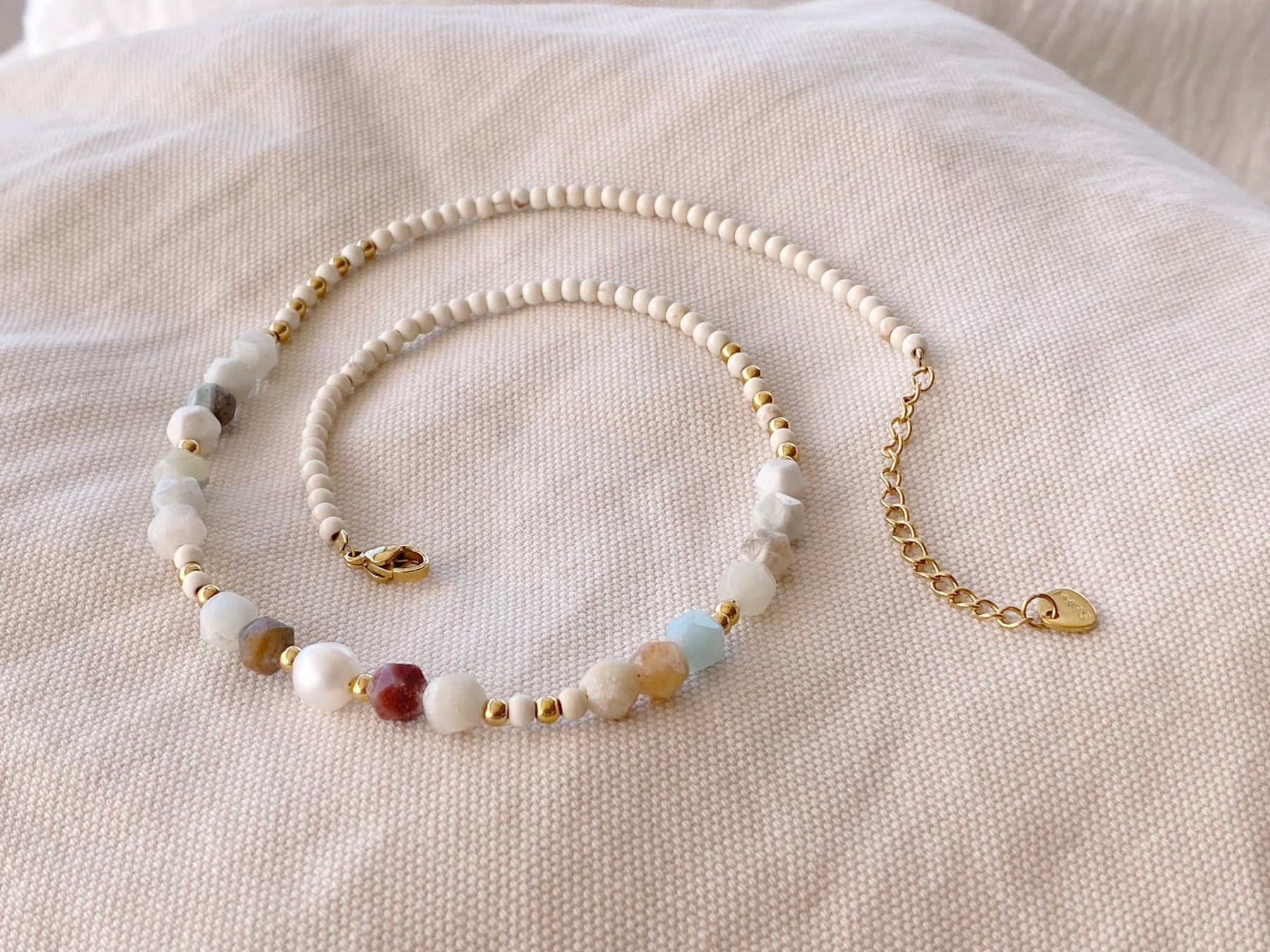 Eine wunderschöne Naturstein Kette mit vielen verschiedenen Edelsteinen und goldenen Edelstahl Perlen. Perfekt für ein naturnahes Boho Styling, chic und wild und einfach besonders! Dank hochwertig vergoldetem chirurgischen Edelstahl ist die Perlenkette absolut hautverträglich.