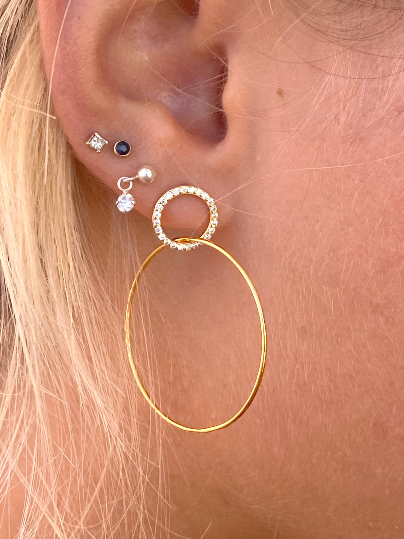Megazart, glamourös und einfach nur wunderschön! Mit unzähligen Zirkonen besetzte Kreisohrstecker halten zwei große filigrane Reifen… Ganz besondere vergoldete Silber Ohrringe für den Alltag und für festliche Anlässe! Dank einer sorgfältigen Verarbeitung und den hochwertigen hypoallergen Materialien wird der Schmuck auch von Menschen mit sensibler Haut bestens vertragen.