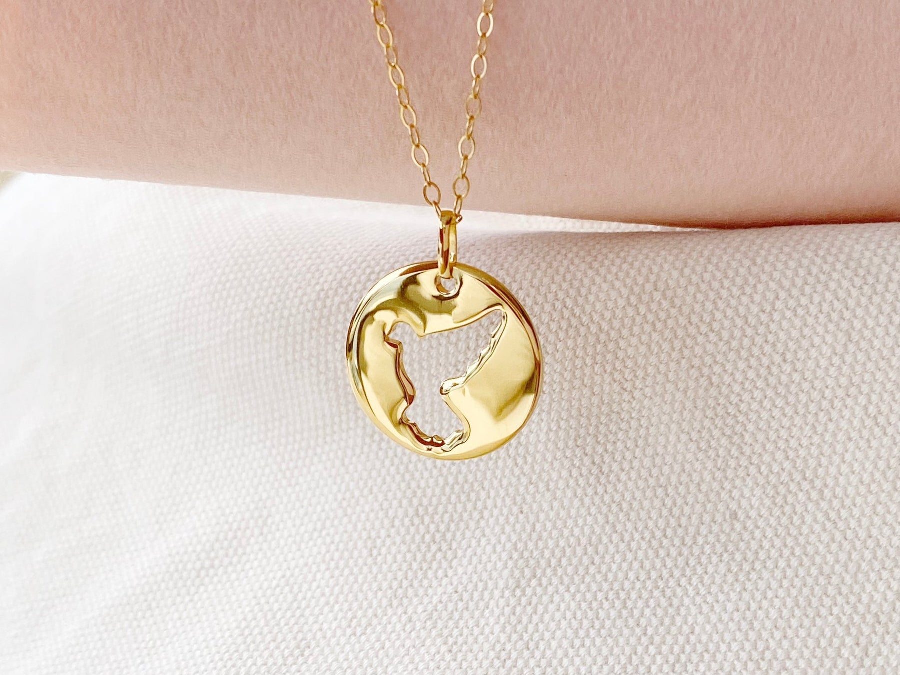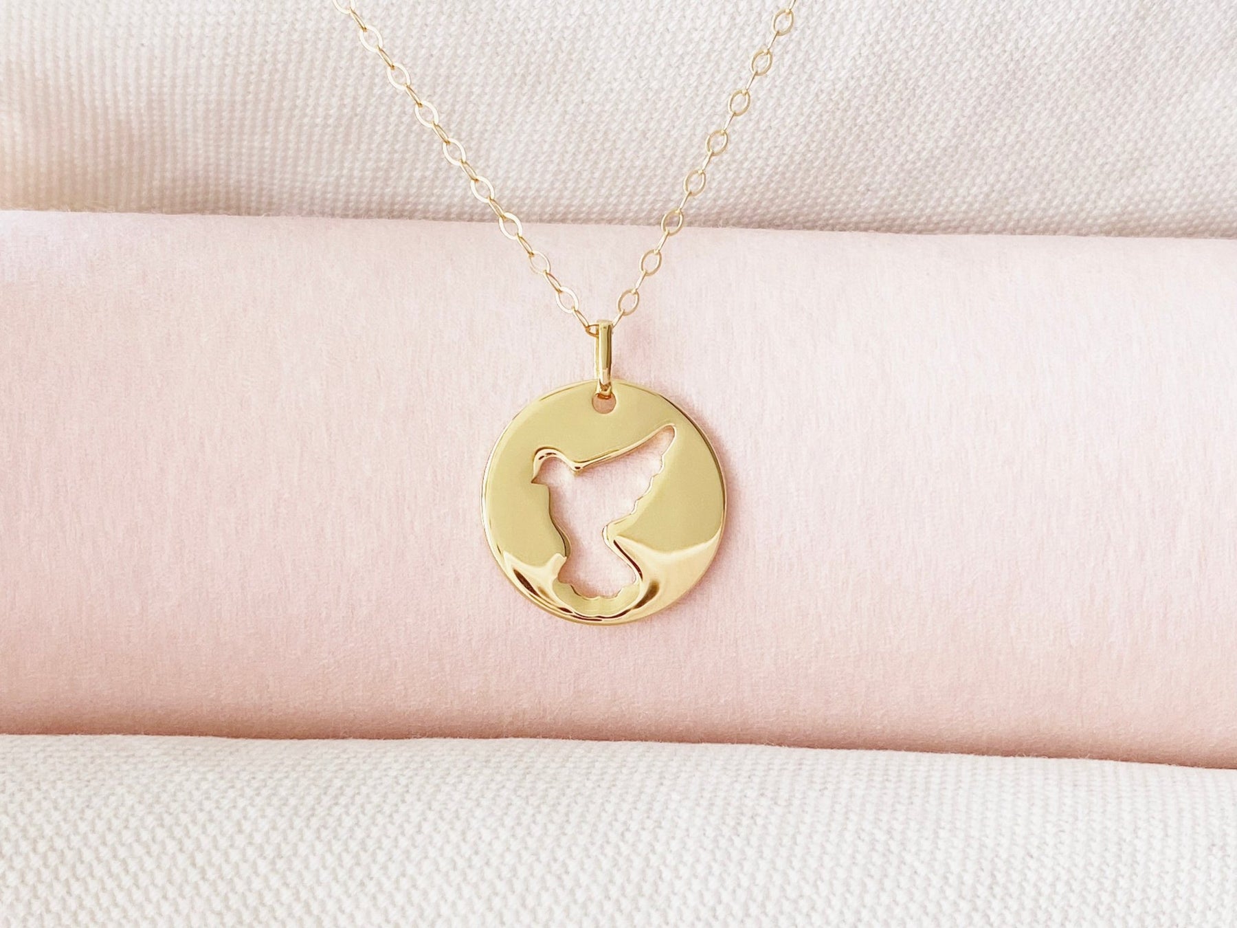 Eine Friedenstaube auf einem sanft glänzenden Coin hängt an einer liebevoll gearbeiteten Kette. Dank präzise geschliffenen Gliedern fängt die Halskette jeden noch so kleinen Lichtstrahl auf und glitzert wunderschön am Hals.
