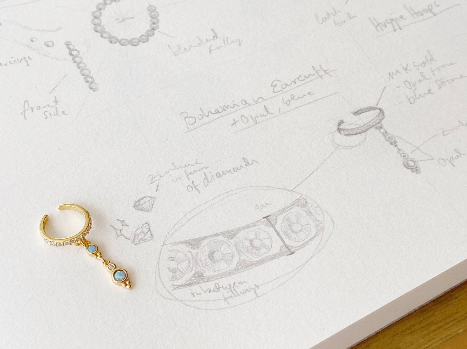 Gold trifft Edelstein. Zart schlingt sich dieser blaue Opal Earcuff ums Ohr - ganz ohne Piercing. Funkelnde Steinchen, ein schimmernder Tropfen-Anhänger, pure Boho-Magie.