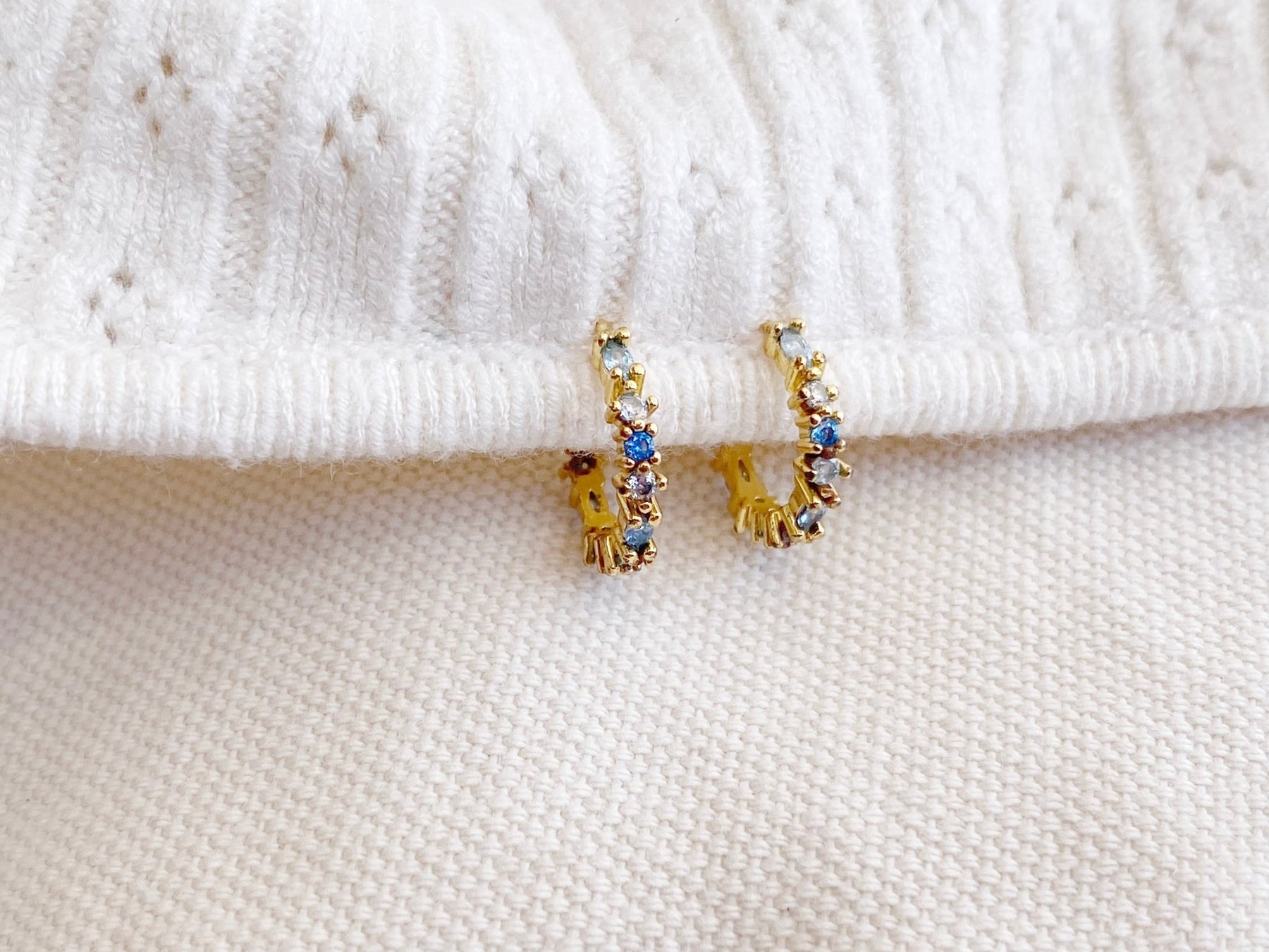Die zierlichen goldenen Huggies mit den bunten Steinen glitzern in den schönsten Blautönen! Dank ihrer minimalen Größe wirren die kleinen Creolen mit dem Ohrstecker Verschluss immer dezent und versüßen dein Outfit mit einem zarten und unaufdringlichen Sprenkeln. Sie sind nicht nur liebevoll zu deiner Haut, sondern auch absolut alltagstauglich und je nach Look ein glitzernder Blickfang zu deinem Partystyle!
