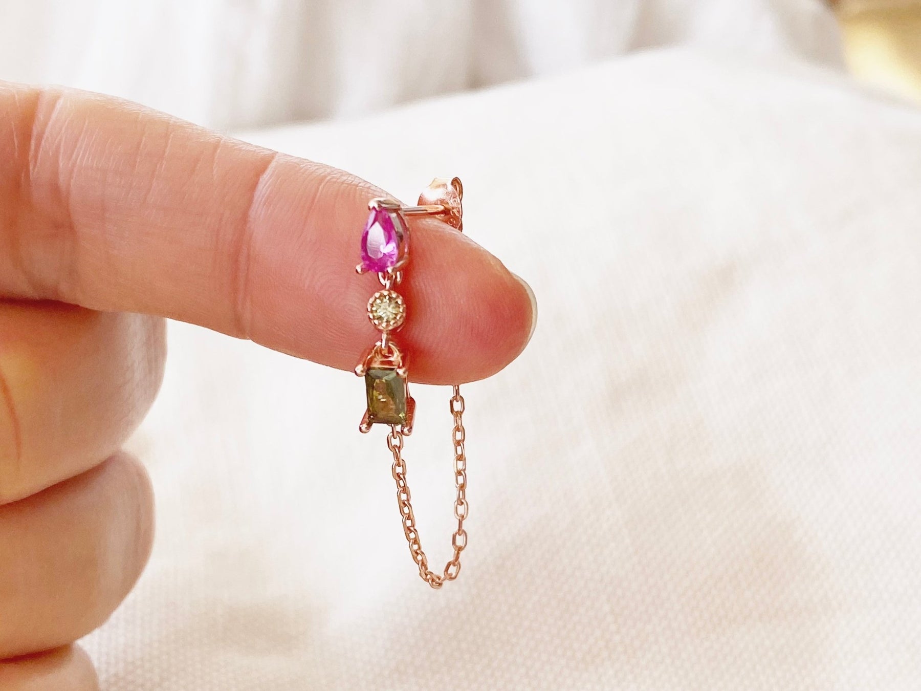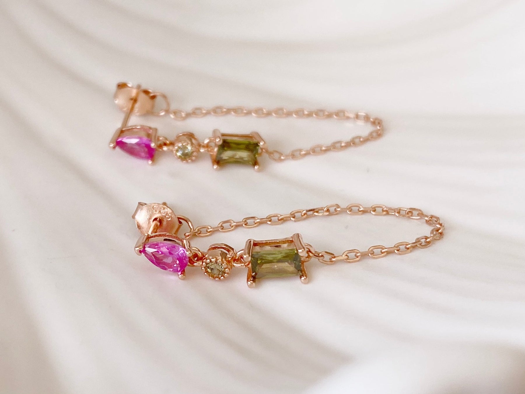 Die rosegoldenen Kristall Ohrringe mit Kettchen bringen sanfte Farbe in dein Leben! In den schönsten Grün- und Pinktönen glitzern die echten Silber Ohrhänger an deinen Ohrläppchen - ein ganz klares Statement für die Romantik. Das Besondere: Ein zartes Kettchen, das vorne am Ohrring sowie hinten am Stecker befestigt ist…