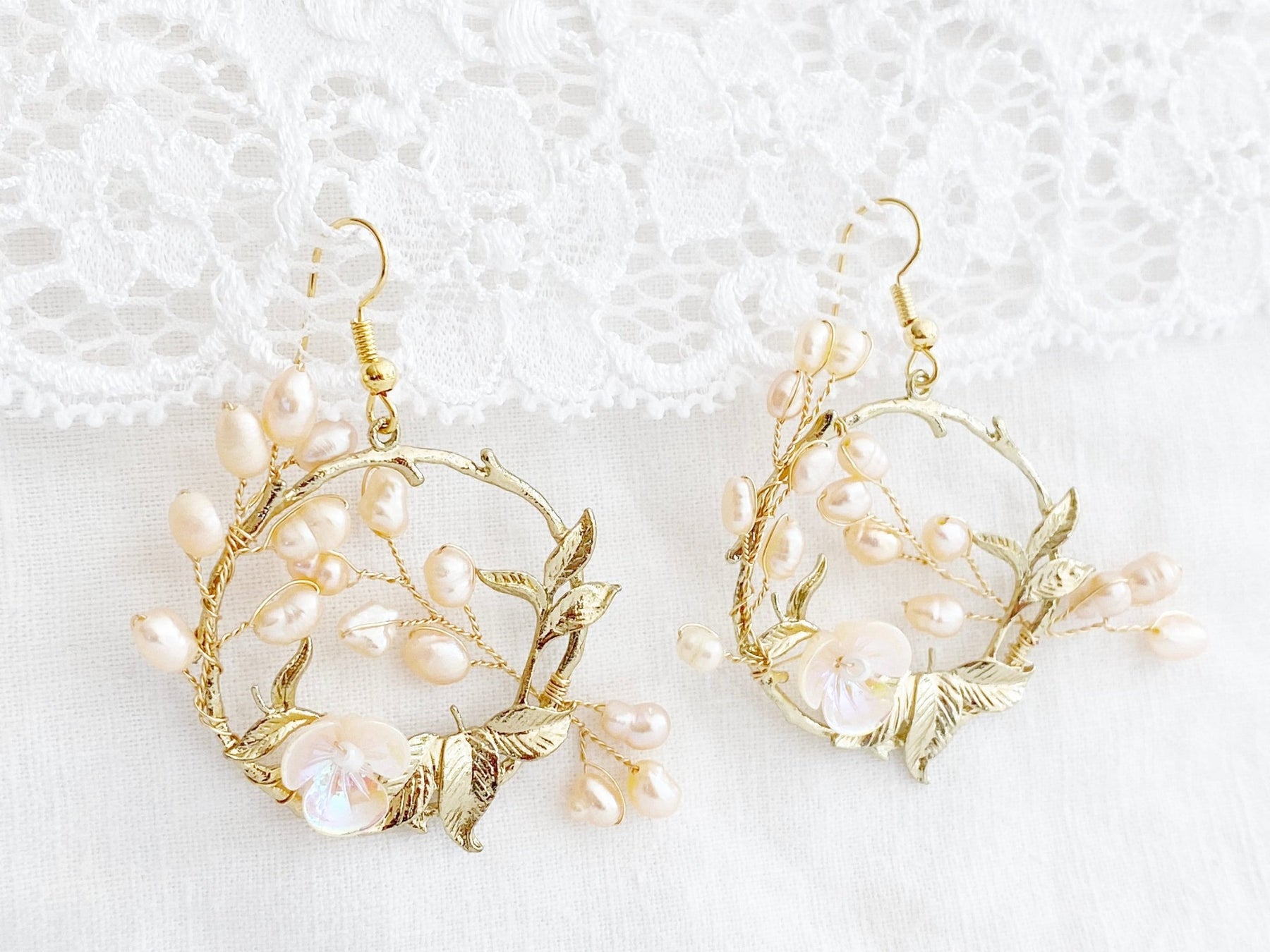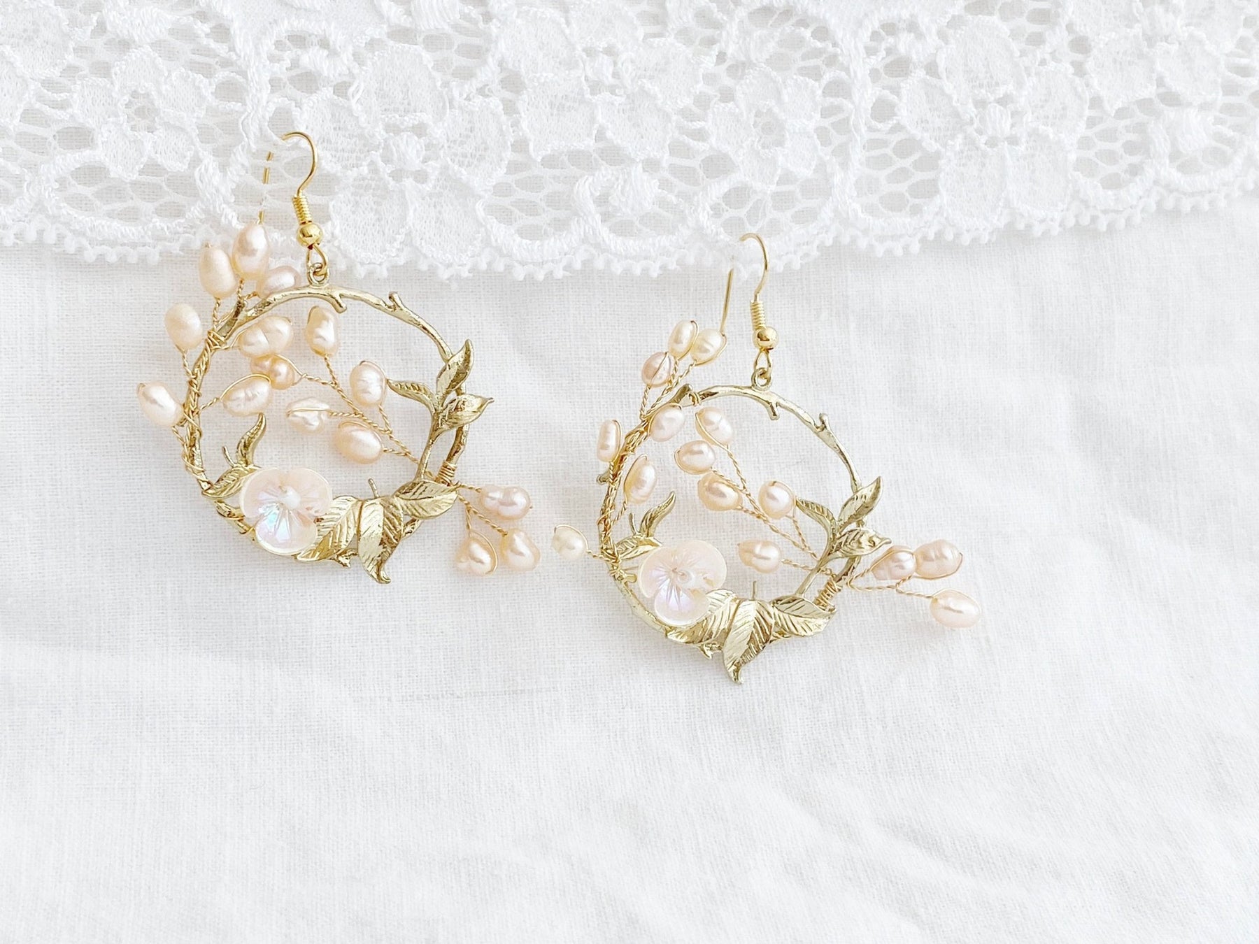These sweet bridal earrings with delicate pearls promise pure romance! A golden vine, genuine pink freshwater pearls, and a blossom – whether you, as a bride, walk down the aisle in jeans and sneakers, a simple mini dress, a hippie style, or a classic long white gown, these wedding earrings will add that certain something to every outfit!